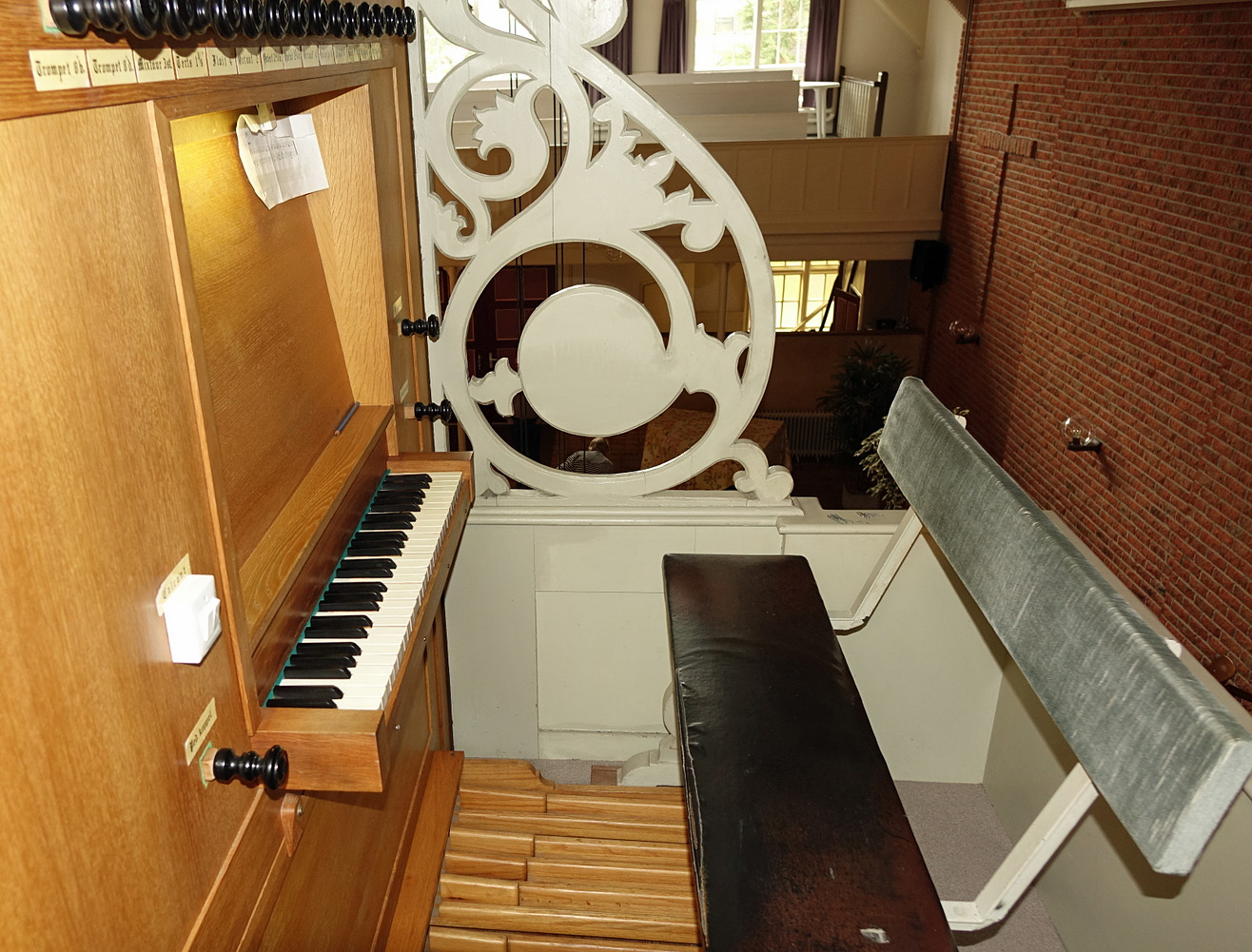 In de pedaal: prestant 16', subbas 16', octaafbas 8', gedekt 8', koraalbas 4', nachthoorn 2', bazuin 16' en trompet 8'.